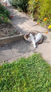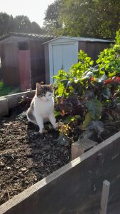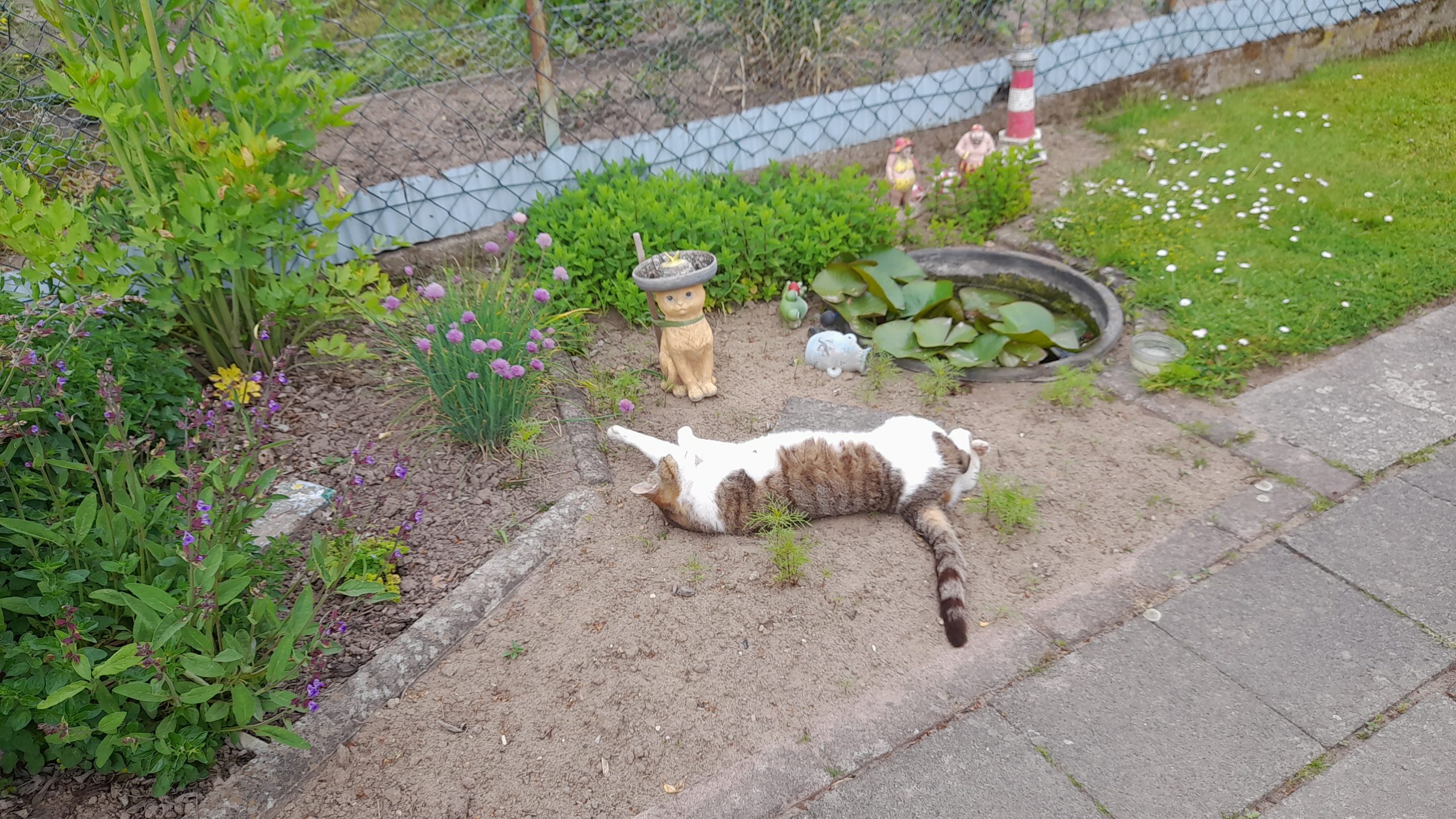 Das ist die Katze Pussy. Sie hat unseren Kleingarten übernommen und uns adoptiert.